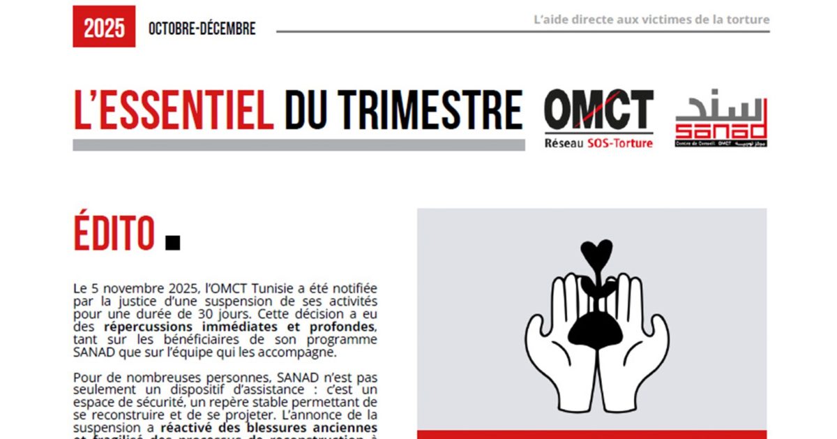 Le numéro d’octobre-décembre 2025 revient sur un trimestre marqué par des défis majeurs, notamment la suspension temporaire des activités de l’OMCT Tunisie, et ses effets concrets sur les personnes accompagnées.